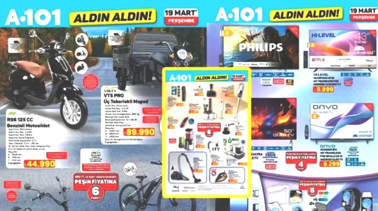 A101 marketlerinin 19 Mart tarihine ait aktüel kataloğu yayımlandı. Bu hafta A101'de dikkat çeken ürünler arasında; 3 tekerlekli Moped 89.990 TL, No-Frost buzdolabı 21.999 TL, Çamaşır Makinesi 14.999 TL ve buharlı ütü 3.299 TL ile raflarda yer alacak. İşte A101 marketin 19 Mart aktüel broşürü.