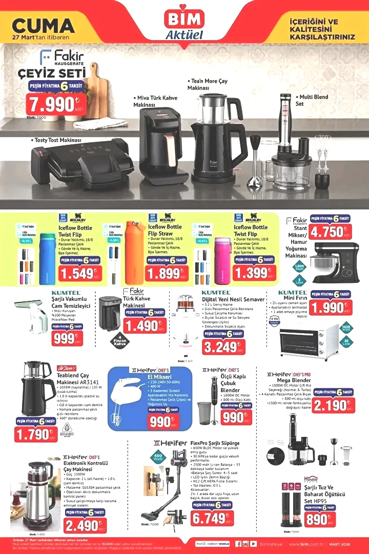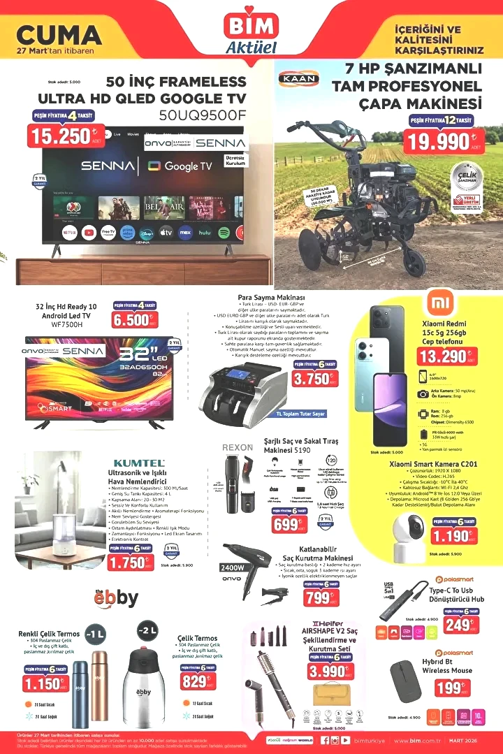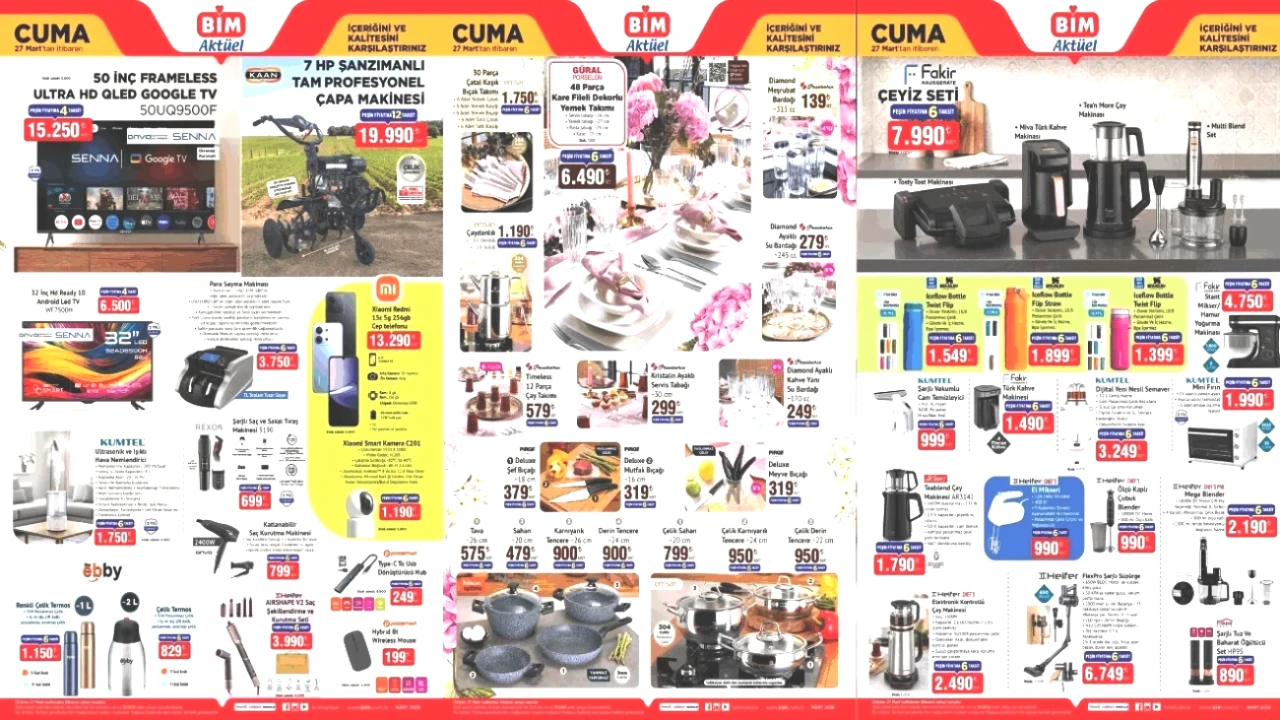 Bu Cuma, BİM marketlerinde çeşitli ürünler, teknolojik cihazlardan mutfak gereçlerine, kişisel bakım malzemelerinden yatak odası eşyalarına kadar birçok farklı seçenekle alışveriş tutkunlarının beğenisine sunulacak. İşte 27 Mart 2026 BİM Cuma gününe ait aktüel ürün broşürü...
